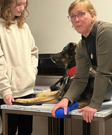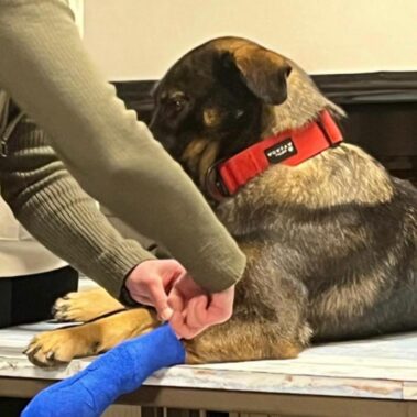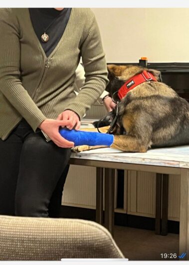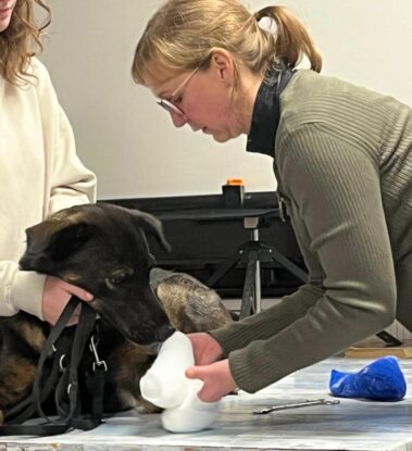 Zu diesen interessanten Themen stellten wir natürlich viele Fragen. Frau Dr. Gürtler beantwortete ausführlich und an Fallbeispielen. Nach so viel Theorie sind wir jetzt in der Lage es in die Praxis umzusetzen. Der praktische Teil unseres Seminars wurde an einem Hund gezeigt. Es handelte sich hierbei um einen Verband an der Pfote. Nach drei Stunden ging das sehr umfangreiche und interessanten Seminar zu Ende. Wir haben sehr viel Wissen mit nach Hause genommen und sind nun in der Lage einen echten Notfall von einer Bagatelle zu unterscheiden.